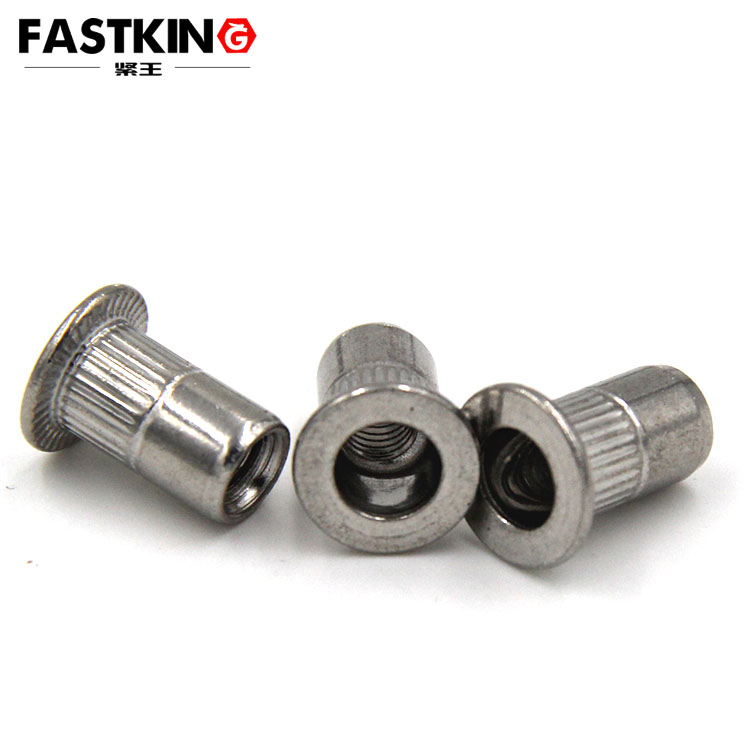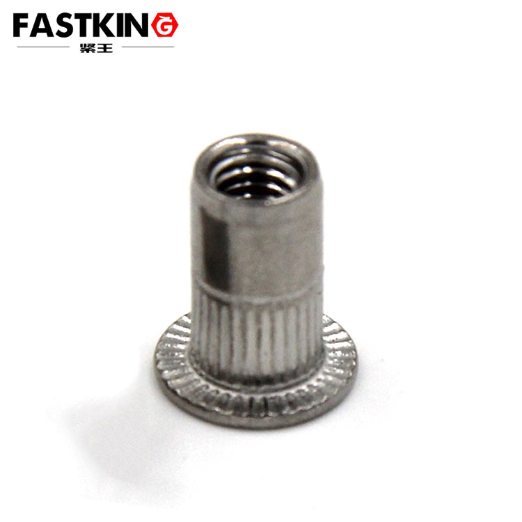 平頭豎條紋壓鉚螺母的結構設計圍繞 “高效裝配” 與 “可靠連接” 兩大核心展開。其頭部為純平面結構,無錐度過渡,厚度通常控制在 1-2mm,安裝后可與被連接件表面完全貼合,平面度誤差≤0.03mm,尤其適合表面無需打孔沉孔、僅能進行平面裝配的場景,如鈑金機箱外殼、設備面板等 —— 相比沉頭螺母,其無需提前加工錐形沉孔,減少了 1-2 道工序,加工效率提升 30% 以上。