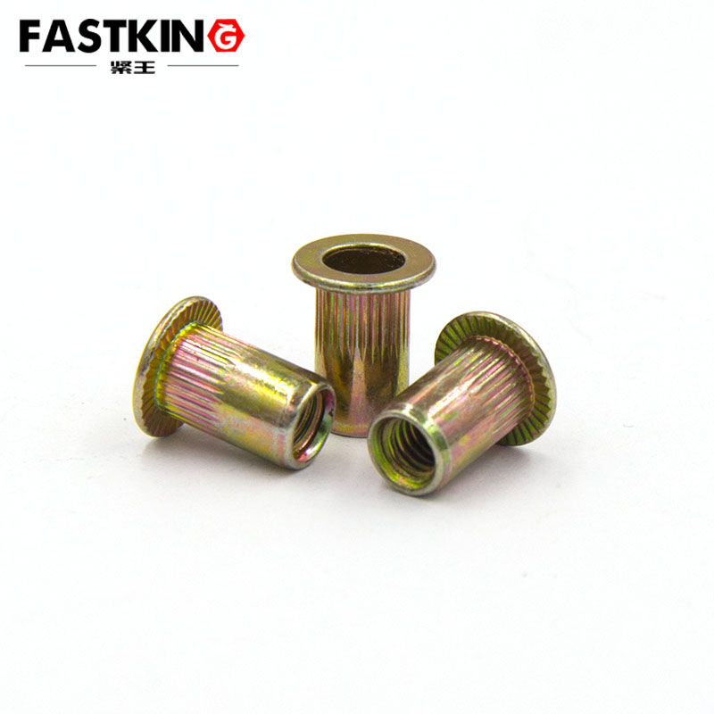 從核心構成來看,彩鋅拉鉚螺母由兩部分關鍵要素組成:一是拉鉚螺母本體,二是表面的彩鋅鍍層。拉鉚螺母本體通常采用優質碳鋼(如 1010、1015 低碳鋼)或不銹鋼材質加工而成,本體結構包含螺紋孔、法蘭邊、鉚接段三部分 —— 螺紋孔用于與螺栓配合實現緊固,法蘭邊可增大接觸面積、防止安裝時工件變形,鉚接段則是拉鉚工藝的核心,通過外力拉伸使鉚接段變形,與工件形成緊密咬合。而彩鋅鍍層作為 “防護外衣”,并非單一涂層,而是通過電解鍍鋅 + 彩色鈍化處理形成的復合鍍層:先在螺母表面沉積一層鋅層,再通過鉻酸鹽鈍化工藝形成彩色鈍化膜,膜層厚度通常控制在 8-12μm,這一厚度既能保證鍍層的附著力,又能提供充足的防銹能力。